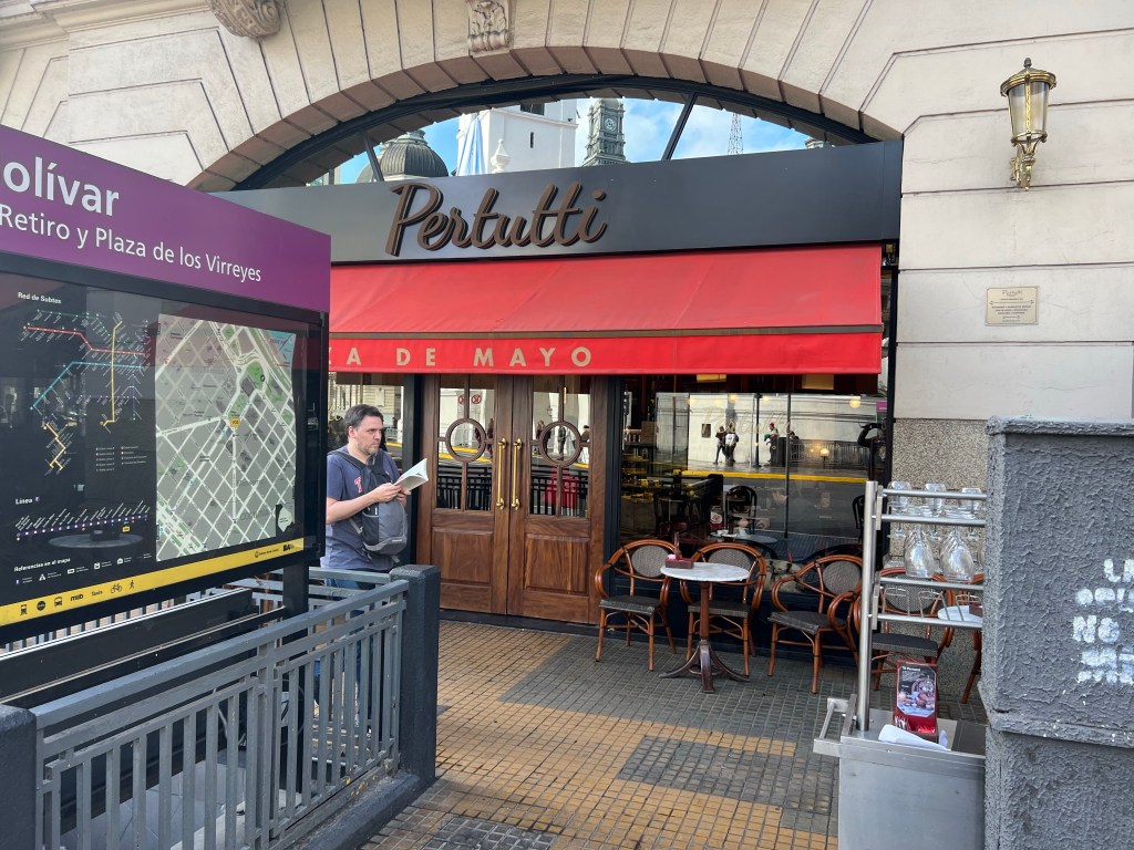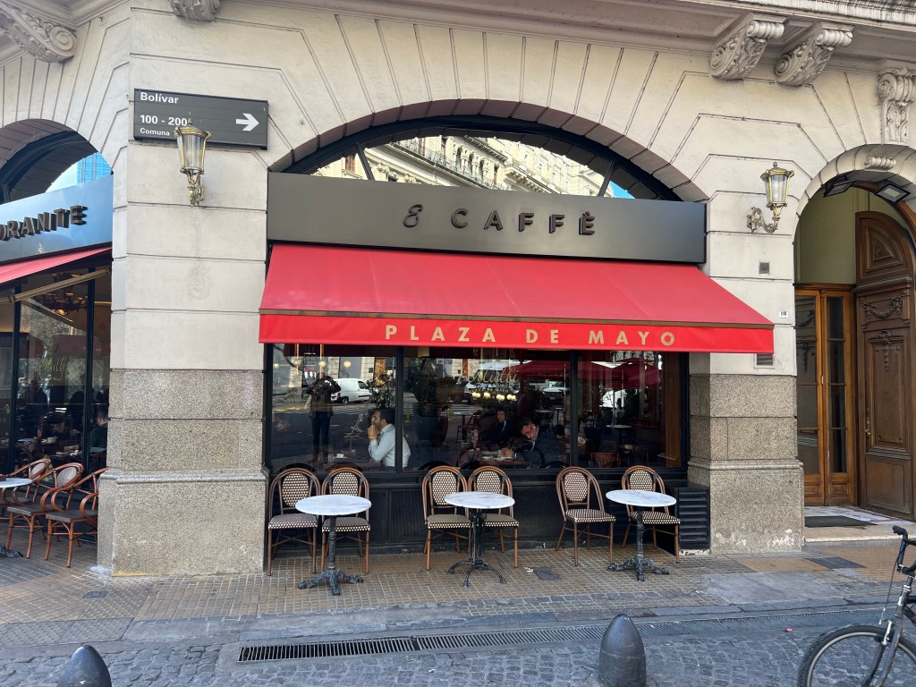 At 1130 we have ‘la Pausa’ when most people go up to the terrace where everyone chats in Spanish and English. I normally take this 30 minutes to go to a café across the road. Not only do they serve the best expresso I have had in BA so far, but it is a good spot for people watching. It’s on the edge of la plaza de Mayo, the central square where Eva and Juan Perón delivered their speeches and where a few revolutions have come to heads. The waiters are in their black and whites and the customers are business people, well to dos and tourists. I sip on an expresso and try to look local.